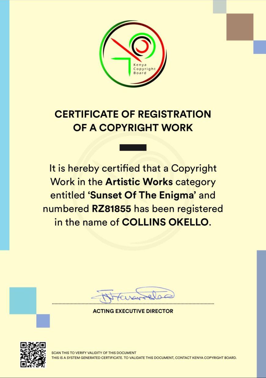 Kisumu-based visual artist Collins Omondi Okello, the creator of the viral “Sunset of the Enigma” artwork depicting the late former Prime Minister Raila Odinga, has officially secured a copyright certificate to protect the piece from unauthorized commercial exploitation.